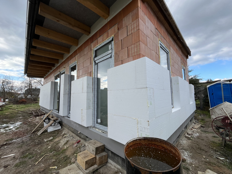 Fasáda byla vytvořena bez zateplení v ploše, pouze se zateplením rizikových míst jako jsou ostění oken a dveří a vytvořením imitací šambrán a říms za použití fasádní vaty. Celkový povrch je oštukován speciální bílou,venkovní, štukovou stěrkou.