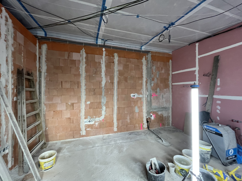 V interiéru proběhly veškeré instalace, položení podlahového vytápění, podkladní vrstvy, podlahy a nové omítky. Až poté jsme montovali snížené sádrokartonové podhledy se speciální instalační mezerou pro vedení rekuperace a dalších rozvodů. Dále následovaly povrchové úpravy a montáž venkovní žaluzie.
