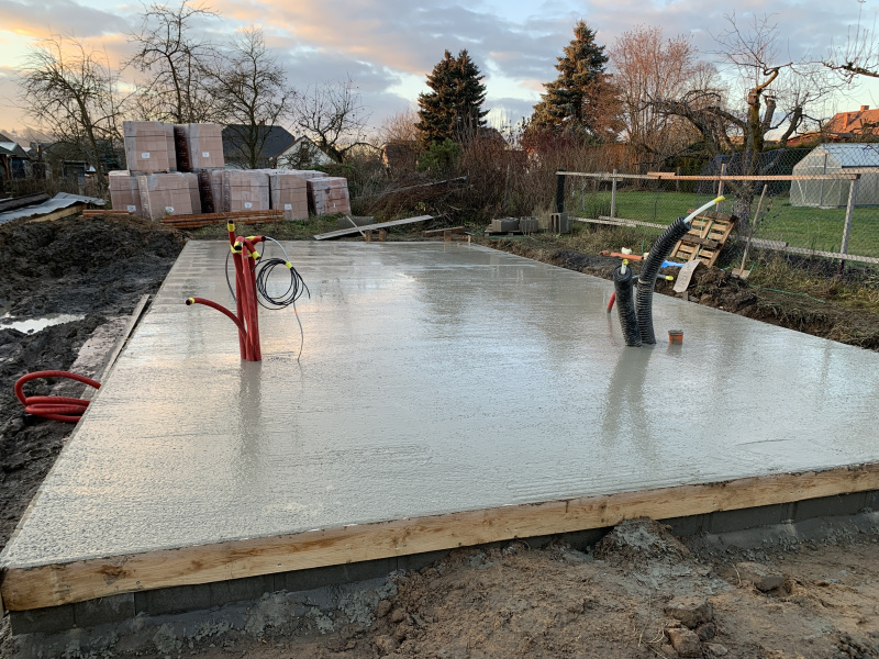 Práce začaly výkopem a betonáží základových pasů s železobetonovou deskou, následovalo zhotovení přípojek a výstavba svislých konstrukcí z porothermu. Poté jsme provedli železobetonový věnec a pultovou střechu s kvalitní fóliovou krytinou z PVC.