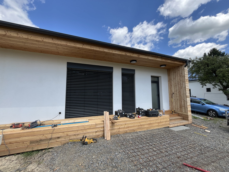 Fasádu jsme doplnili dřevěnými prvky a kolem domku vznikla dřevěná terasa se závětřím. Ze zbylého materiálu jsme navíc vyrobili masivní lavičku.